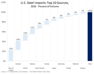 As shown below, Canada and Mexico ranked first and third, respectively, in terms of sources of imported steel, in 2018. That’s 30% of all imported steel (regardless of product type), and has been consistent year-over-year.