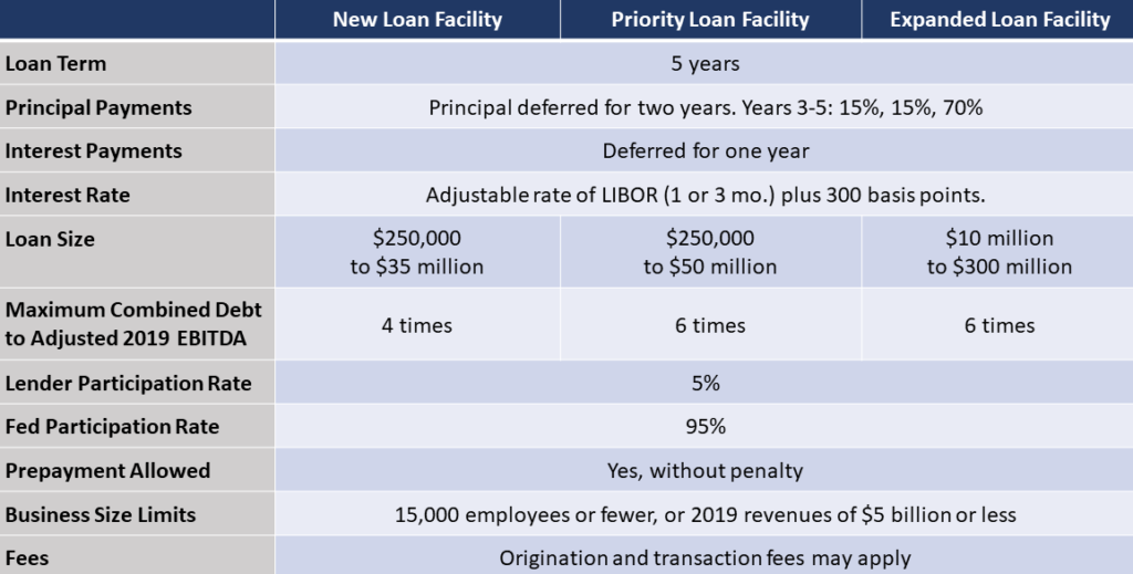 Set for below is an informational chart provided by the Federal Reserve setting forth the terms of the three Main Street Loan programs and links to the term sheets for each loan published by the Federal Reserve.