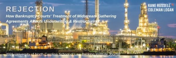 Kane Russell Coleman Logan attorneys John Kane, Gordon Russell, Kyle Woodard and Kathleen Thompson authored an in-depth article titled Rejection: How Bankruptcy Courts’ Treatment of Midstream Gathering Agreements Affects Underwriting and Restructuring for the March 2021 issue of the University of North Carolina School of Law Banking Institute's law review journal.  The article addresses potential disputes between upstream debtors and their midstream counterparties, a debtor's ability to reject economically disadvantageous midstream contracts, the underwriting risks associated with midstream contracts for lenders to upstream exploration and production companies, and recent developments in case law affecting debtors’ and lenders’ rights with respect to midstream contracts.