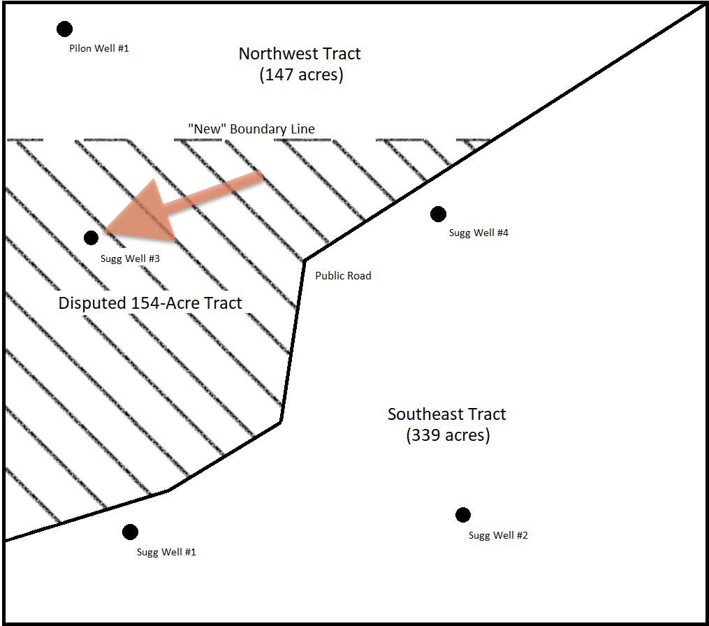 In 2008, the operator on the Southeast Tract sent a so-called "boundary stipulation" to the mineral owner on the Northwest Tract. The stipulation sought to clarify that the border between the two leases was not the public county road pictured above; instead, according to the stipulation, the boundary was further north (as represented by the dashed line). The mineral owner signed the stipulation, and the operator proceeded to drill a well (the Sugg #3) inside the "new," enlarged boundaries of the Southeast Tract. (The well is identified by a red arrow on the map.)