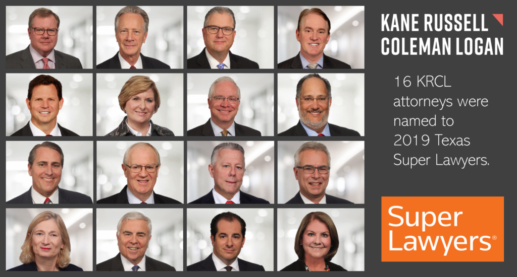Kane Russell Coleman Logan is proud to announce that 16 of the firm’s attorneys have been included in the 2019 Texas Super Lawyers ranking. Each year, the list published by Thomson Reuters recognizes less than five percent of attorneys in Texas for their professional achievements.
